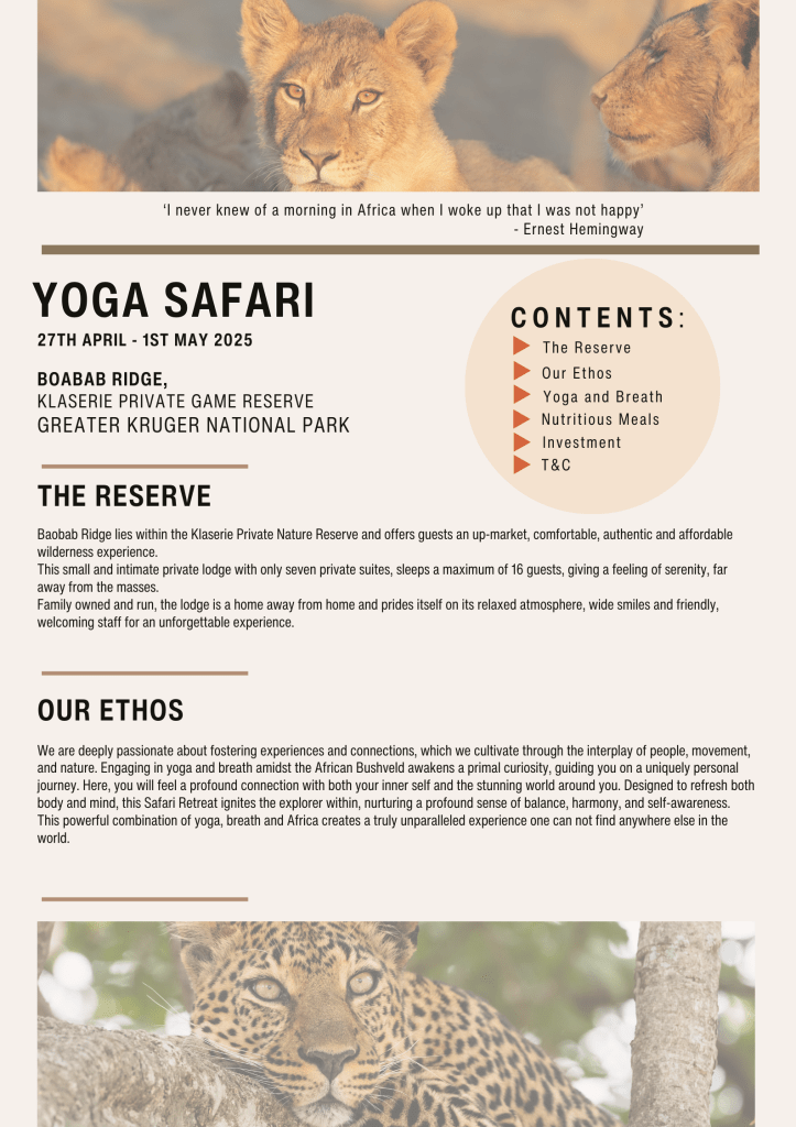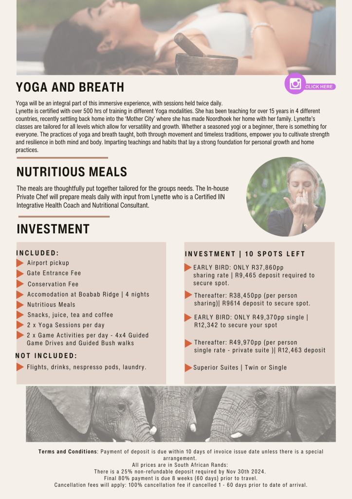 “We are deeply passionate about fostering experiences and connections, which we cultivate through the interplay of people, movement, and nature. Engaging in yoga and breath amidst the African Bushveld awakens a primal curiosity, guiding you on a uniquely personal journey. Here, you will feel a profound connection with both your inner self and the stunning world around you. Designed to refresh both body and mind, this Yoga Safari Retreat ignites the explorer within, nurturing a profound sense of balance, harmony, and self-awareness.